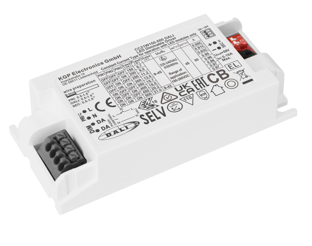 A KGP CC21W150-500 DALI egy kompakt, sokoldalú és magas technikai tudású LED meghajtó, amely kisebb teljesítményű LED panelek, spotlámpák és egyéb állandó áramot igénylő világítótestek precíz vezérlésére lett tervezve. A legújabb DALI-2 tanúsítvánnyal és AM Dimming technológiával rendelkezik a tökéletesen villogásmentes szabályozás érdekében.