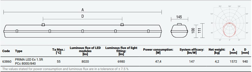 A PRIMA LED Ex PCc egy robbanásveszélyes környezethez tervezett, II. csoport 3. kategóriájú (2-es és 22-es zóna) LED világítótest. Alkalmas olyan ipari környezetekbe, ahol robbanásveszélyes gázok, porok vagy éghető gőzök vannak jelen. A lámpatest megfelel a 2014/34/EU ATEX irányelvnek, valamint a 116/2016. (VI. 27.) Korm. rendeletnek. A burkolat és a test ütésálló, UV-álló polikarbonátból készült, így fokozott ellenállást nyújt a mechanikai hatásokkal és a kedvezőtlen környezeti feltételekkel szemben. A reflektor fehér színű acéllemezből készült. A világítótest energiatakarékos működést biztosít, akár 45%-kal alacsonyabb energiafogyasztással a hagyományos fénycsöves megoldásokhoz képest.